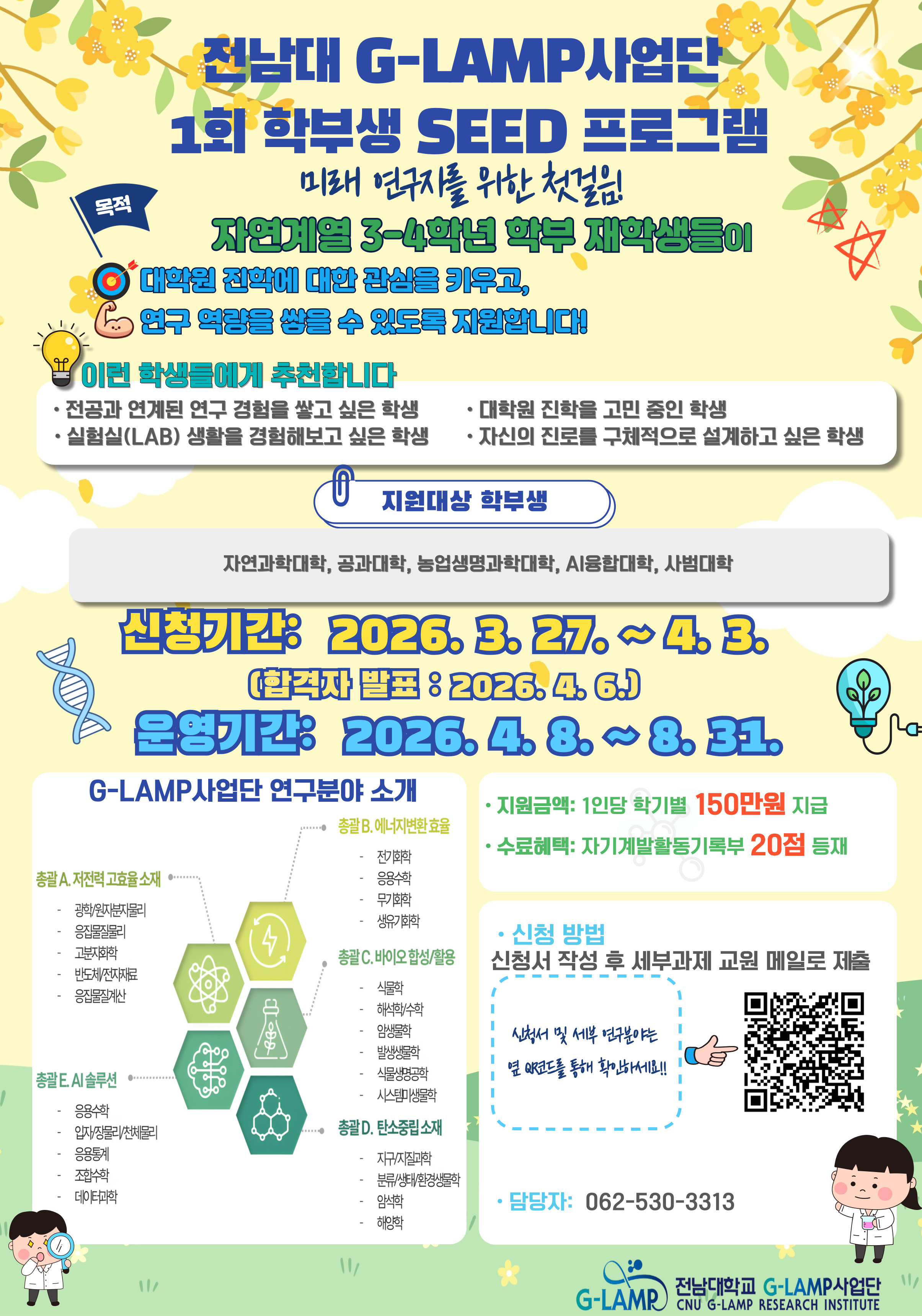 자연계열 학부생의 글로컬 연구역량을 향상하고자 「2026 G-LAMP SEED PROGRAM」운영하오니